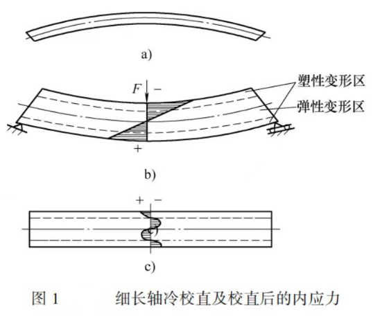 2) 冷校直產(chǎn)生的內(nèi)應(yīng)力。一些剛性較差、容易變形的工件(如絲杠),通常采用冷校直的方法修正變形。圖1b所示的工件中部受到載荷F的作用時,工件內(nèi)部產(chǎn)生應(yīng)力,其軸心線以上產(chǎn)生壓應(yīng)力,其軸心線以下產(chǎn)生拉伸應(yīng)力,而且兩條虛線之間為彈性變形區(qū),虛線之外為塑性變性區(qū)。去掉外力后,工件的彈性恢復(fù)收到塑性變形區(qū)的阻礙,致使內(nèi)應(yīng)力重新分布如圖1c所示。由此可見,工件經(jīng)冷校直后內(nèi)部產(chǎn)生內(nèi)應(yīng)力,處于不穩(wěn)定狀態(tài)。