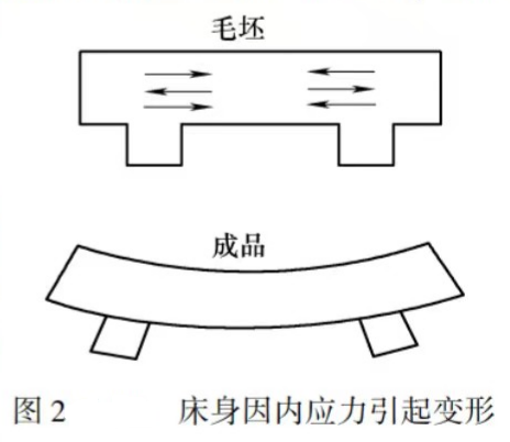 3) 切削加工中產(chǎn)生的內(nèi)應(yīng)力。工件切削加工時,在各種力和熱的作用下,各部分將產(chǎn)生不同程度的塑性變形及金相組織變化從而產(chǎn)生內(nèi)應(yīng)力,引起工件變形。實(shí)踐證明,在加工過程中切去表面一層金屬后,所引起內(nèi)應(yīng)力重新分布,變形最為劇烈。因此粗加工后,應(yīng)將被夾緊的工件松開使它有時間使內(nèi)應(yīng)力重新分布。否則,在繼續(xù)加工時工件處于彈性應(yīng)力狀態(tài)下,而在加工完成后必然要逐漸產(chǎn)生變形,致使破壞最終工序所得到的精度。圖2所示為床身因內(nèi)應(yīng)力引起變形。