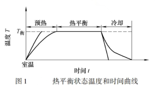 工藝系統(tǒng)受熱源影響,溫度逐漸升高,與此同時(shí),其熱量通過各種傳導(dǎo)方式向周圍散發(fā)。當(dāng)單位時(shí)間內(nèi)的熱量傳入與傳出相等時(shí),溫度不再升高,這時(shí)工藝系統(tǒng)就達(dá)到熱平衡狀態(tài)。在熱平衡狀態(tài)下,工藝系統(tǒng)各部分的溫度就保持在一個(gè)相對(duì)固定的數(shù)值上,因而各部分熱變形也就相應(yīng)地趨于穩(wěn)定。圖1所示為熱平衡狀態(tài)溫度和時(shí)間曲線圖。